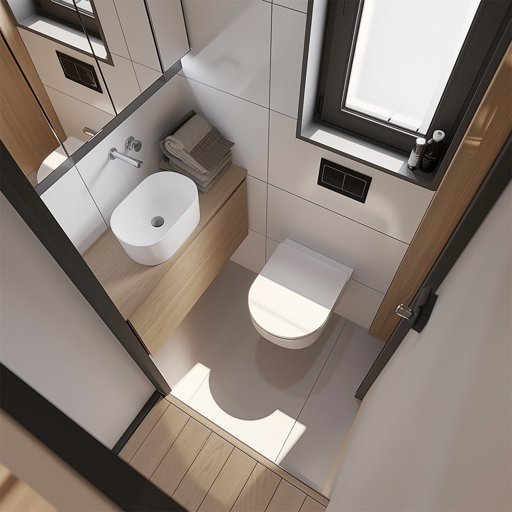 Die ideale Lösung für Gäste-WCs oder kleine Bäder, dank seiner platzsparenden Abmessungen von 45 cm Länge und 36 cm Breite. Trotz seiner kompakten Größe bietet es den vollen Komfort und Funktionalität eines herkömmlichen WC. Der passende verkürztes WC-Sitz ergänzt das Set mit Absenkautomatik und abnehmbarer Funktion für eine bequeme und hygienische Nutzung. Diese Kombination aus Raumersparnis und Komfort ist die optimale Wahl für moderne Wohnräume mit begrenztem Platzangebot.