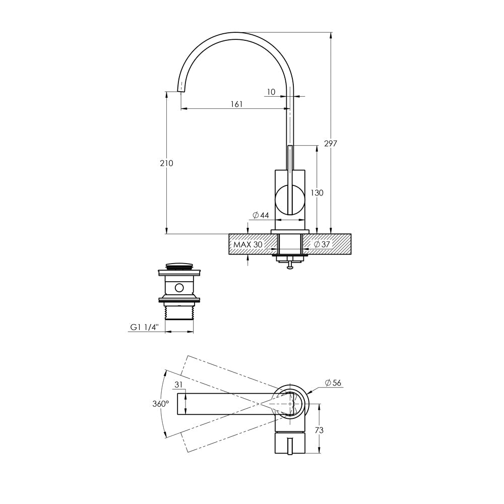 Einhebelmischbatterie | Höhe 297 mm | Ausladung 160 mm | Auslauf schwenkbar | Keramikkartusche | Druckverschluss für Becken mit Überlauf | Flexschläuche 3/8"" | in Matt Schwarz
